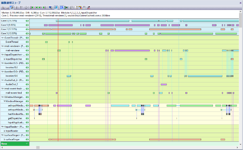 膨大なテキストログを一つひとつ追いかけるのではなく、ソフトウェアの動きを「グラフィカルに表示」します。関数遷移、タスク実行タイミング、変数値、CPU負荷、実行・周期時間、カバレッジなどを同一の時間軸上で可視化することで、システム全体の動きが直感的に把握できるようになり、原因の特定をサポートします。