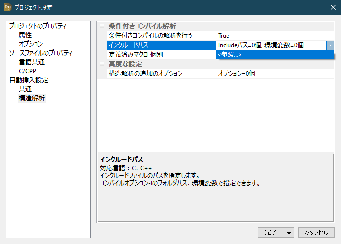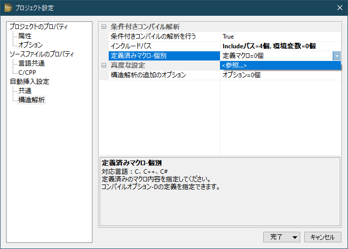 [構造解析]を選択し、ソースコード構造解析に必要な条件付きコンパイル解析の設定を行います。