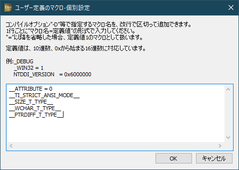 - コンパイルオプションの”-D”などで指定するマクロ内容を指定します。