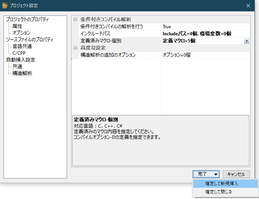 条件付きコンパイル解析の設定後[完了]→[確定して新規挿入]を選択します。