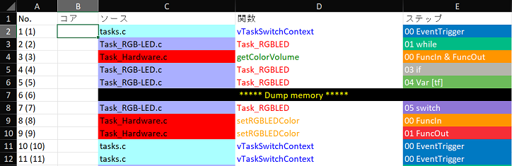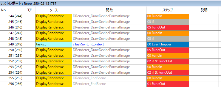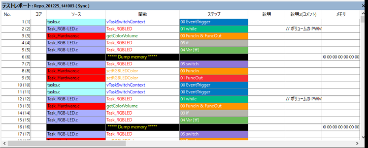 テストレポートのソース、関数、ステップのカラム毎にパターンマッチをもとにした色分けを設定することができます。