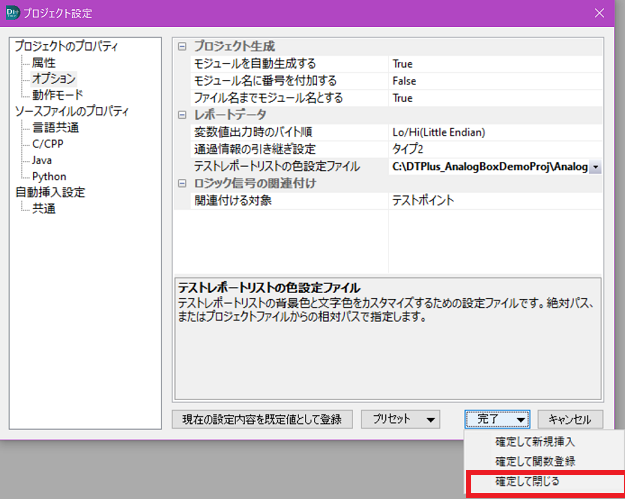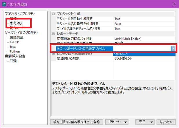 [ファイル]→[プロジェクト設定]を選択し、[オプション]の[テストレポートリストの色設定ファイル]から設定を行ってください。