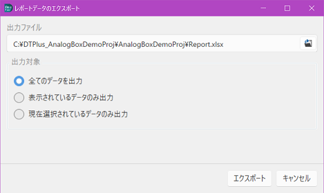 - レポートデータのエクスポートダイアログが表示されますので、出力ファイルと出力対象を選択して[エクスポート]をクリックします。