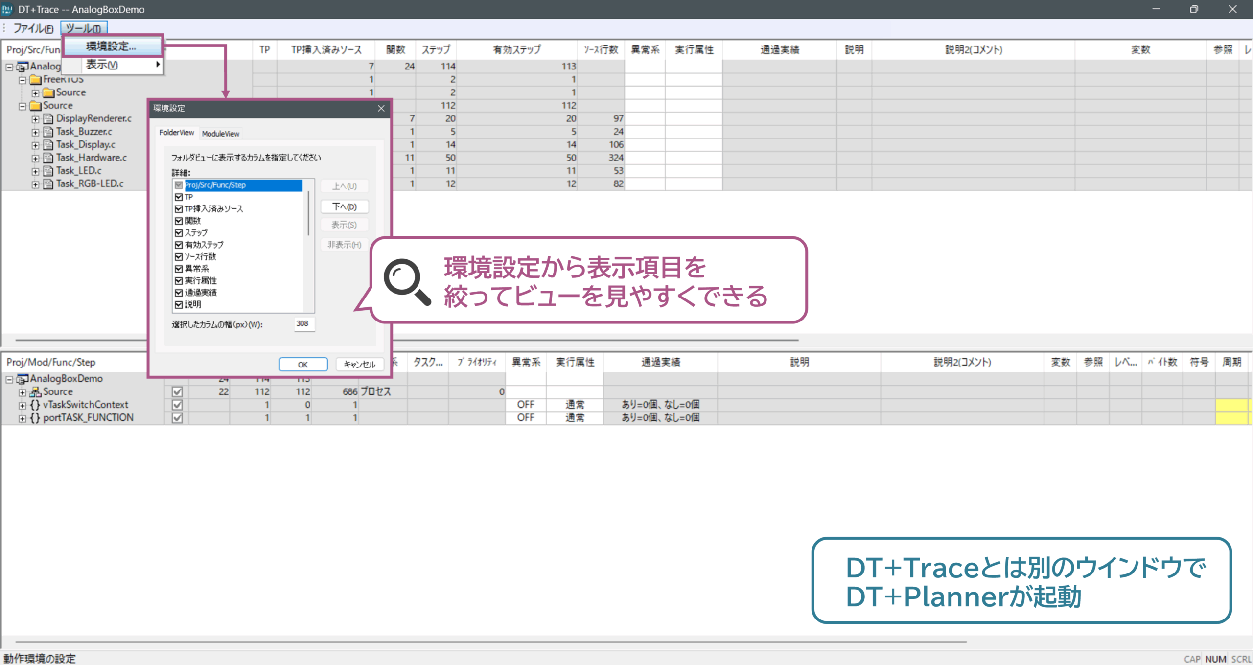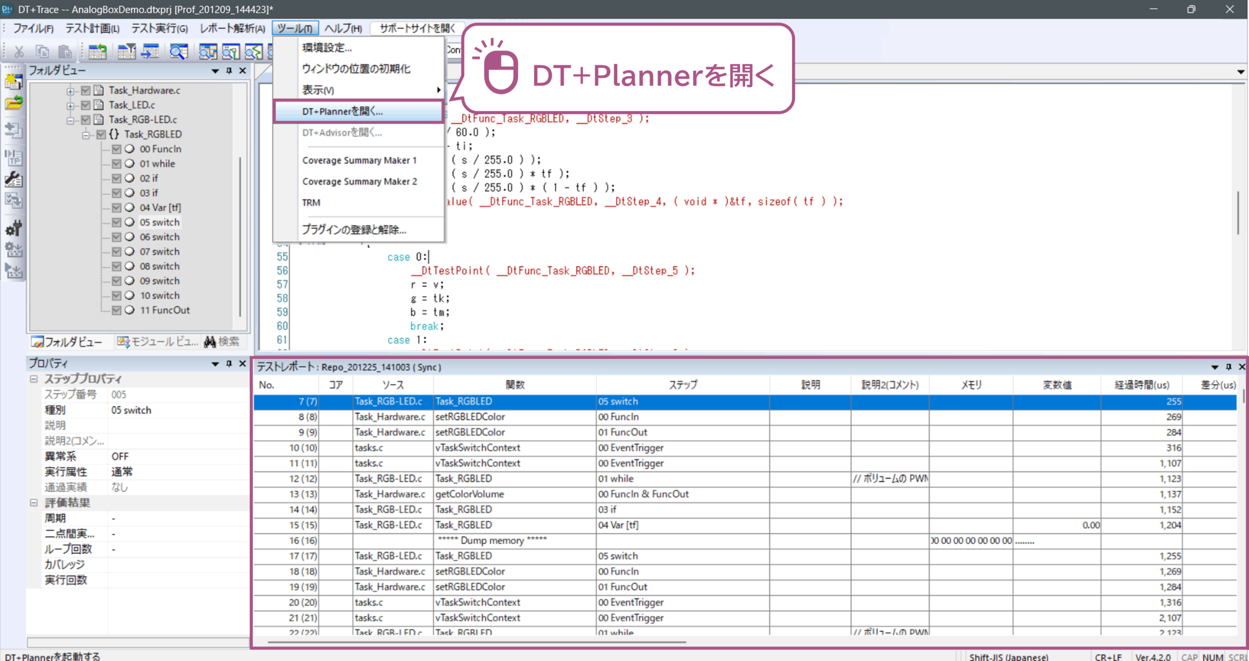 次にDT+Trace上でテストレポートを表示したまま、DT+Plannerを開いてください。