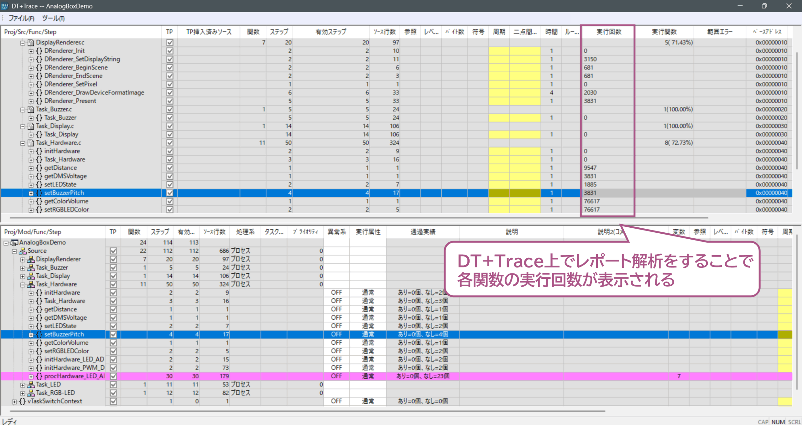 DT+Plannerを開いた状態で、DT+Trace上で「レポートデータの解析」を行うと、DT+Planner上で各関数の「実行回数」が解析されて表示されます。