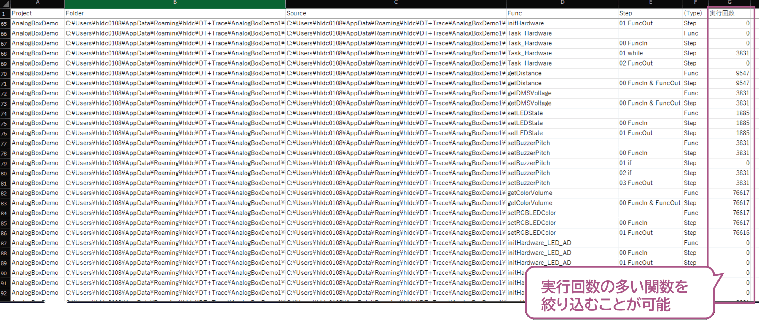 エクスポート結果から「実行回数」のカラムをフィルタリングすることで、実行回数の多い関数を効率的に絞り込んで行くことができます。